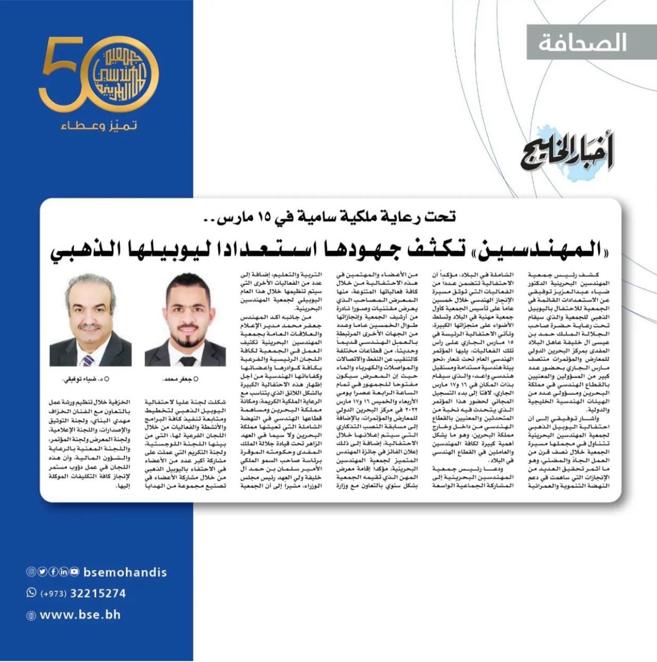 كشف‭ ‬رئيس‭ ‬جمعية‭ ‬المهندسين‭ ‬البحرينية‭ ‬الدكتور‭ ‬ضياء‭ ‬عبدالعزيز‭ ‬توفيقي‭ ‬عن‭ ‬الاستعدادات‭ ‬القائمة‭ ‬في‭ ‬الجمعية‭ ‬للاحتفال‭ ‬باليوبيل‭ ‬الذهبي‭ ‬للجمعية‭ ‬والذي‭ ‬سيقام‭ ‬تحت‭ ‬رعاية‭ ‬حضرة‭ ‬صاحب‭ ‬الجلالة‭ ‬الملك‭ ‬حمد‭ ‬بن‭ ‬عيسى‭ ‬آل‭ ‬خليفة‭ ‬عاهل‭ ‬البلاد‭ ‬المفدى‭ ‬بمركز‭ ‬البحرين‭ ‬الدولي‭ ‬للمعارض‭ ‬والمؤتمرات‭ ‬منتصف‭ ‬مارس‭ ‬الجاري‭ ‬بحضور‭ ‬عدد‭ ‬كبير‭ ‬من‭ ‬المسؤولين‭ ‬والمعنيين‭ ‬بالقطاع‭ ‬الهندسي‭ ‬في‭ ‬مملكة‭ ‬البحرين‭ ‬ومسؤولي‭ ‬عدد‭ ‬من‭ ‬الهيئات‭ ‬الهندسية‭ ‬الخليجية‭ ‬والدولية‭.‬