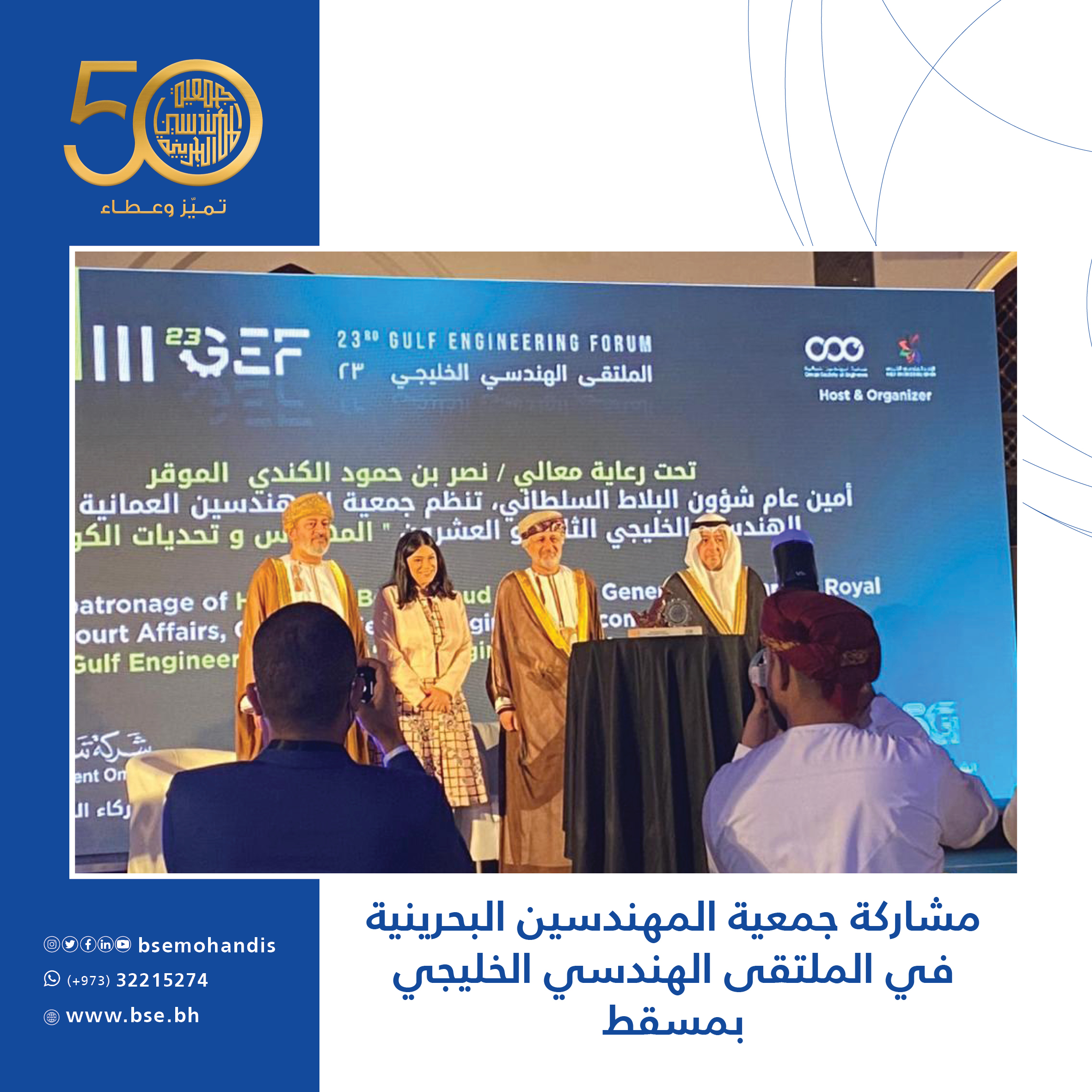 شاركت جمعية المهندسن البحرينية في الملتقى الهندسي الخليجي في الملتقى الهندسي الخليجي و الذي عقد بمسقط في الفترة ما بين 20 – 22 مارس الجاري بوفد برئاسة الدكتورة رائدة العلوي الأمين المالي للجمعية والمهندس حبييب الجبوري مدير لجنة الأنشطة بالإضافة الى عدد من المهندسين أعضاء الجمعية  لحضور هذا الحدث السنوي.