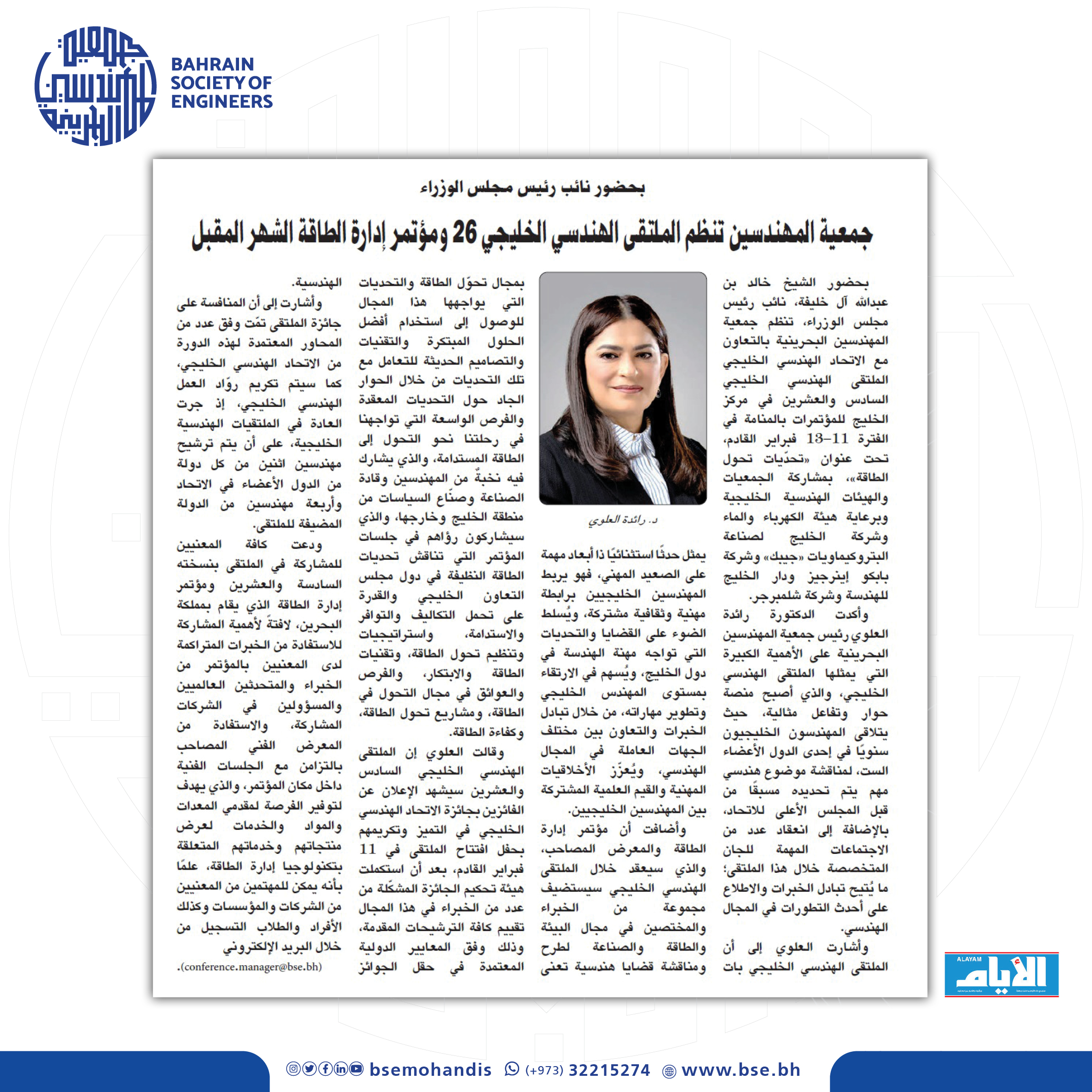 بحضور معالي الشيخ خالد بن عبد الله آل خليفة، نائب رئيس مجلس الوزراء، تنظم جمعية المهندسين البحرينية بالتعاون مع الاتحاد الهندسي الخليجي الملتقى الهندسي الخليجي السادس والعشرين في مركز الخليج للمؤتمرات بالمنامة في الفترة 11 – 13 فبراير القادم والذي يقام هذا العام تحت عنوان “تحدّيات تحول الطاقة”، وبمشاركة الجمعيات والهيئات الهندسية الخليجية وبرعاية هيئة الكهرباء والماء وشركة الخليج لصناعة البتروكيماويات (جيبك) وشركة بابكو إينرجيز ودار الخليج للهندسة وشركة شلمبرجر.