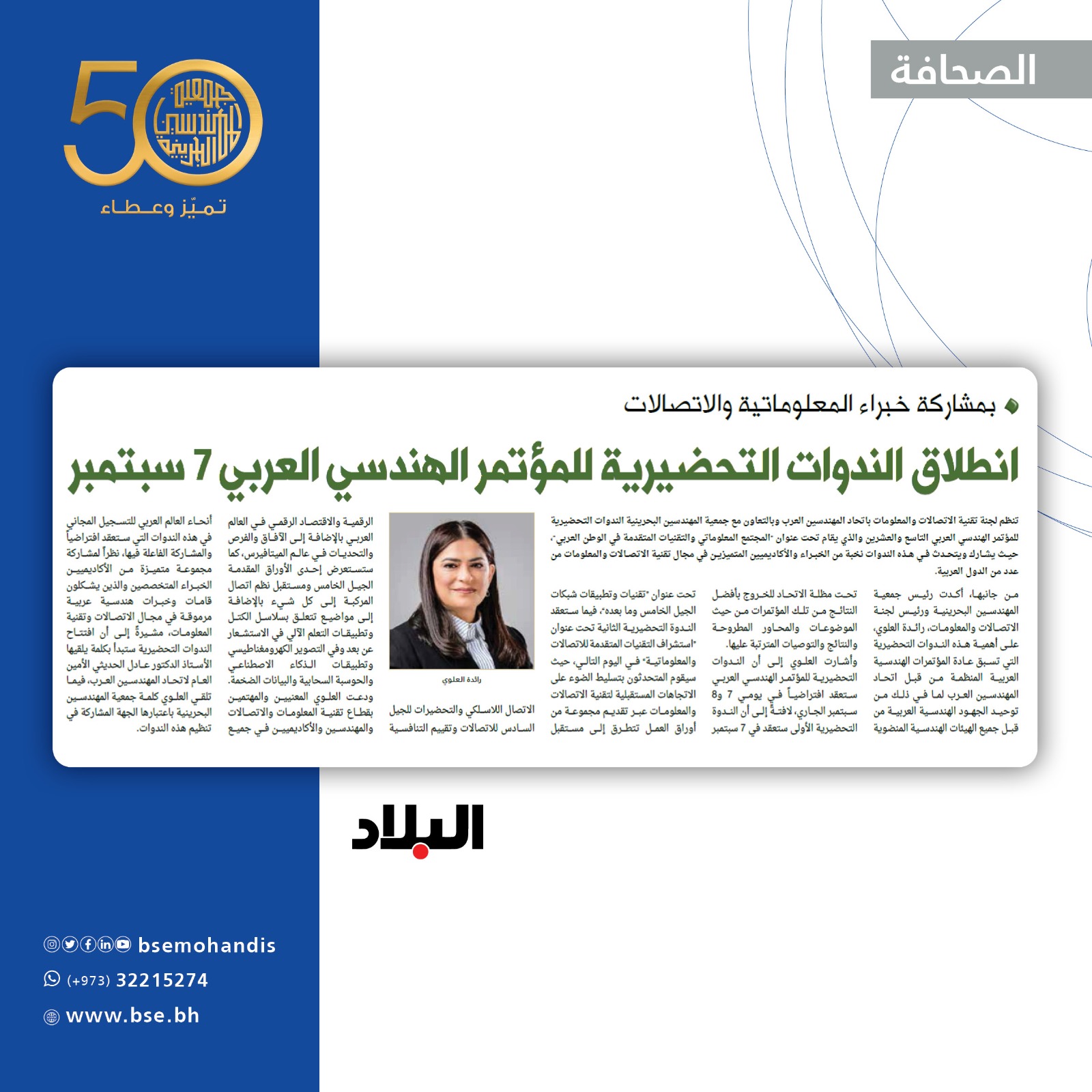 ودعت العلوي المعنيين والمهتمين بقطاع تقنية المعلومات والاتصالات والمهندسين والاكاديميين في جميع أنحاء العالم العربي للتسجيل المجاني في هذه الندوات التي ستعقد افتراضياً والمشاركة الفاعلة فيها، نظراً لمشاركة مجموعة متميزة من الأكاديميين الخبراء المتخصصين والذين يشكلون قامات وخبرات هندسية عربية مرموقة في مجال الاتصالات وتقنية المعلومات، مشيرةً إلى أن افتتاح الندوات التحضيرية ستبدأ بكلمة يلقيها الأستاذ الدكتور عادل الحديثي الأمين العام لاتحاد المهندسين العرب فيما تلقي العلوي كلمة جمعية المهندسين البحرينية باعتبارها الجهة المشاركة في تنظيم هذه الندوات.