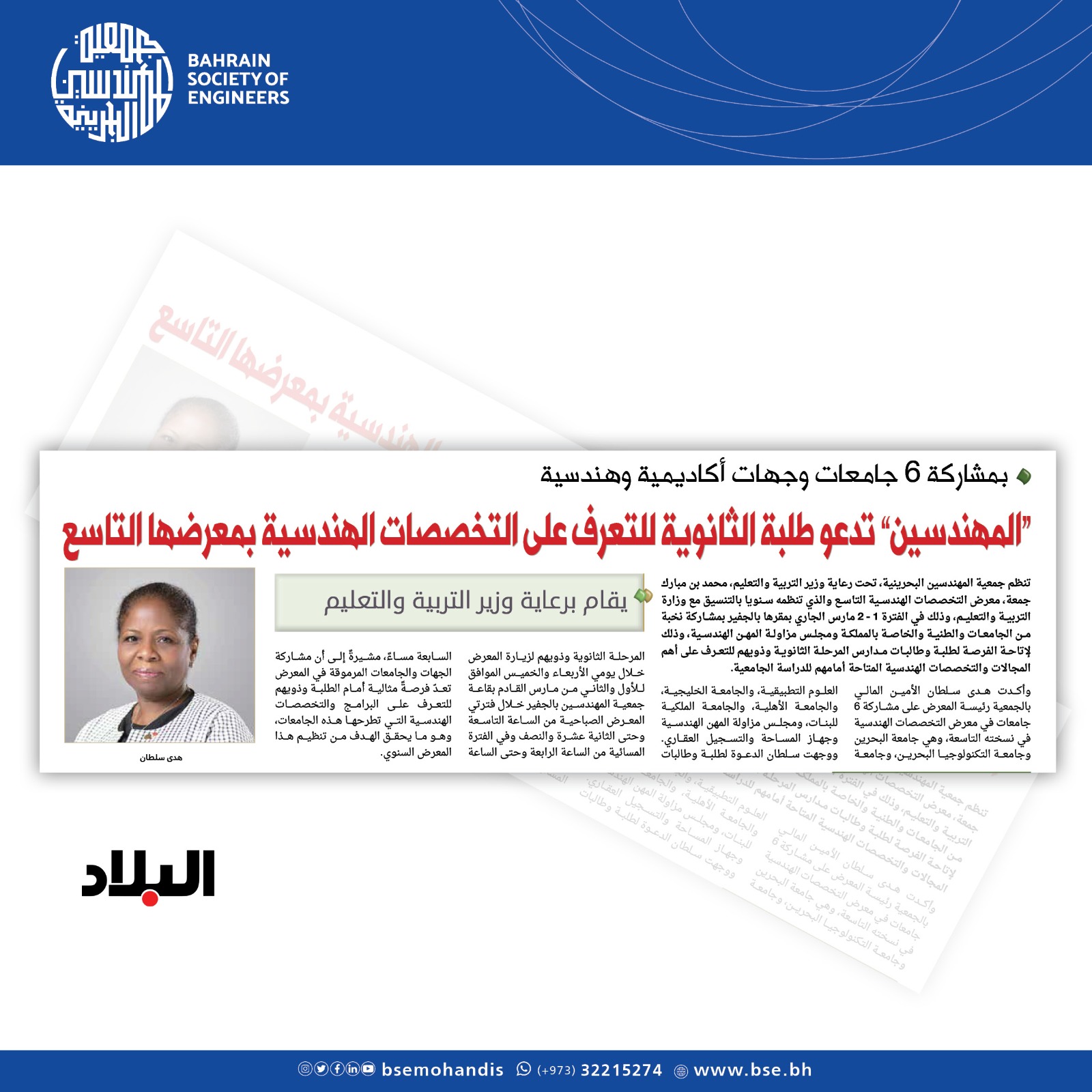 ووجهت المهندسة سلطان الدعوة لطلبة وطالبات المرحلة الثانوية وذويهم لزيارة المعرض خلال يومي الأربعاء والخميس الموافق للأول والثاني من مارس القادم بقاعة جمعية المهندسين بالجفير خلال فترتي المعرض الصباحية من الساعة التاسعة وحتى الثانية عشرة والنصف وفي الفترة المسائية من الساعة الرابعة وحتى الساعة السابعة مساءً، مشيرةً إلى أن مشاركة الجهات والجامعات المرموقة في المعرض تعدّ فرصةً مثالية أمام الطلبة وذويهم للتعرف على البرامج والتخصصات الهندسية التي تطرحها هذه الجامعات، وهو ما يحقق الهدف من تنظيم هذا المعرض السنوي وهو تشجيع طلبة المدارس الثانوية الحكومية والخاصة وبفرعيها العلمي والصناعي على الالتحاق بالتخصصات الهندسية المناسبة لميولهم والمتوافقة مع متطلبات سوق العمل، وكذلك الالتقاء بأهل الخبرة والاختصاص من المهندسين والأكاديميين في هذا المعرض الذي بات من أهم المعارض التي تحرص جمعية المهندسين البحرينية على تنظيمها والموجه لشريحة الطلبة المقبلين على دراسة الهندسة.