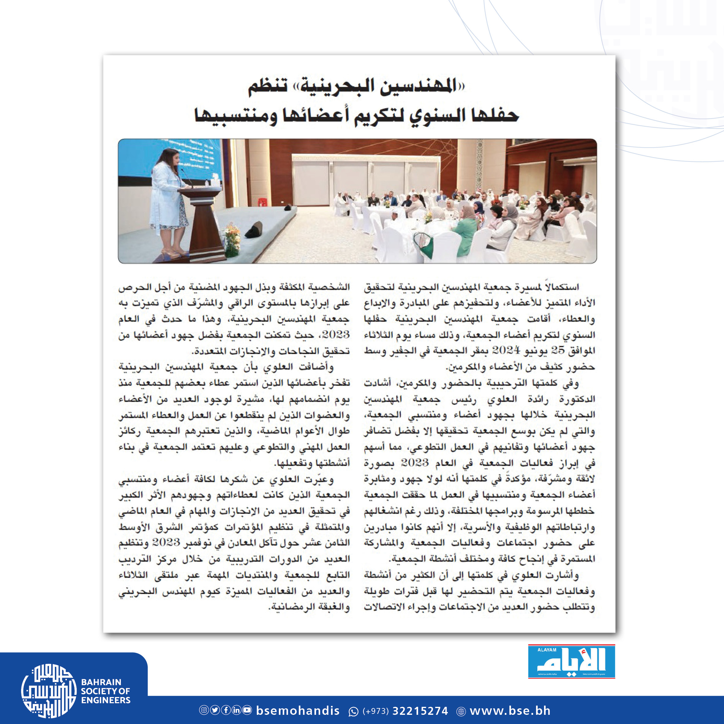 وعبرت العلوي عن شكرها لكافة أعضاء ومنتسبي الجمعية الذين كانت لعطاءاتهم وجهودهم الأثر الكبير في تحقيق العديد من الإنجازات والمهام في العام الماضي والمتمثلة في تنظيم المؤتمرات كمؤتمر الشرق الأوسط الثامن عشر حول تآكل المعادن في نوفمبر 2023 وتنظيم العديد من الدورات التدريبية من خلال مركز التدريب التابع للجمعية والمنتديات الهامة عبر ملتقى الثلاثاء والعديد من الفعاليات المميزة كيوم المهندس البحريني والغبقة الرمضانية وتكريم الفائزين في جائزة الجمعية وإصدار نشرة “المهندس تايمز” الشهرية ومجلة “المهندس” الفصلية، والمشاركة في اجتماعات اتحاد المهندسين العرب والاتحاد الهندسي الخليجي، والاتحاد العالمي للمنظمات الهندسية، والعديد من الفعاليات الأخرى، معبرة عن شكرها وتقديرها وكافة أعضاء مجلس الإدارة ومنتسبي الجمعية  إلى كافة الوزاراتِ والمؤسسات الحكومية والأهلية التي كان لتعاونها ودعمها لجمعية المهندسين البحرينية أطيب الأثر في إنجاح فعالياتِ وأنشطة وبرامج الجمعية.