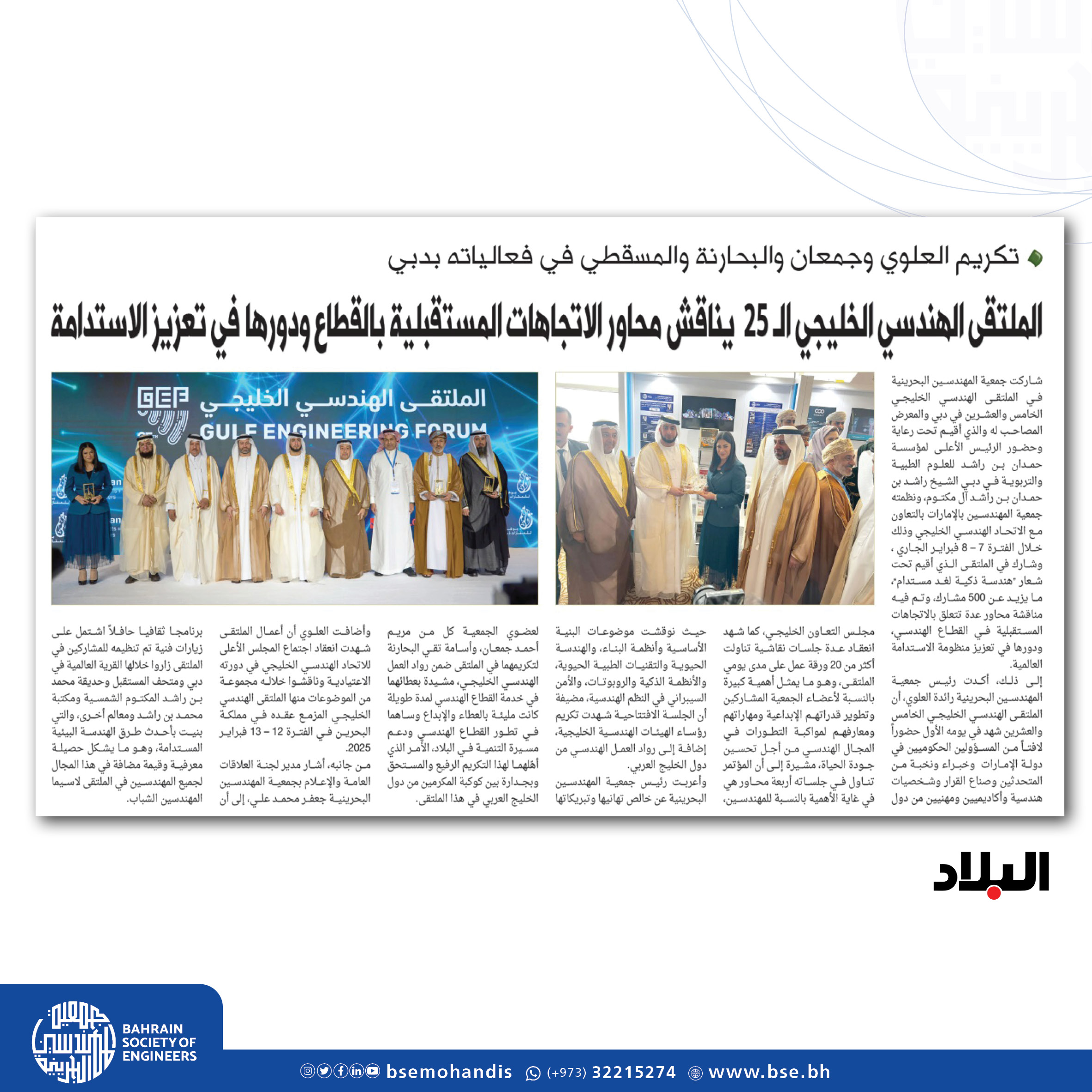 شاركت جمعية المهندسين البحرينية في الملتقى الهندسي الخليجي الخامس والعشرين في دبي والمعرض المصاحب له والذي أقيم تحت رعاية وحضور الشيخ راشد بن حمدان بن راشد آل مكتوم، الرئيس الأعلى لمؤسسة حمدان بن راشد للعلوم الطبية والتربوية في دبي، ونظمته جمعية المهندسين بالإمارات بالتعاون مع الاتحاد الهندسي الخليجي وذلك خلال الفترة 7 – 8 فبراير الجاري ، وشارك في الملتقى الذي أقيم تحت شعار “هندسة ذكية لغد مستدام”، ما يزيد عن 500 مشارك، وتم فيه مناقشة عدة محاورتتعلق بالاتجاهات المستقبلية في القطاع الهندسي، ودورها في تعزيز منظومة الاستدامة العالمية.