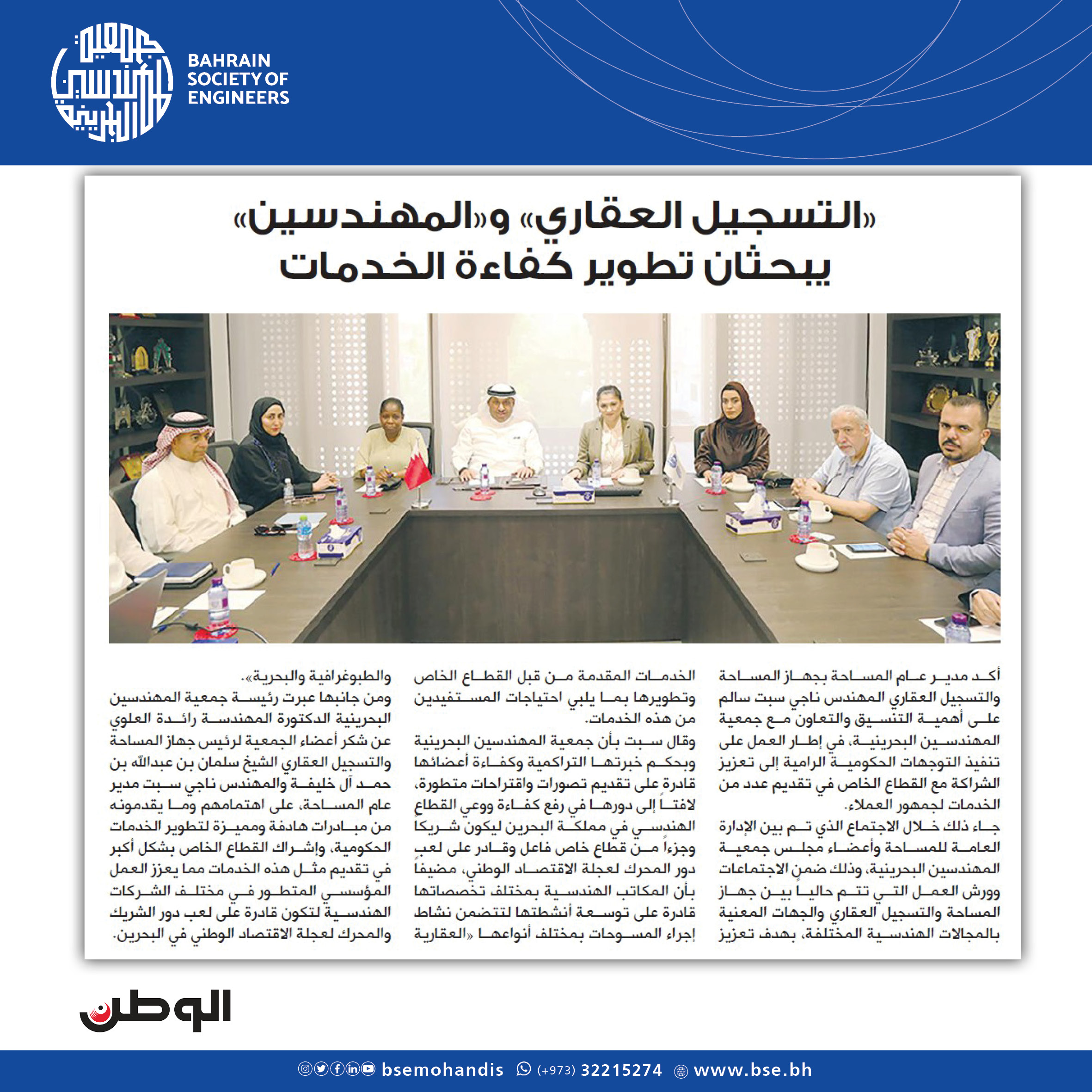 جاء ذلك خلال الاجتماع الذي تم بين الإدارة العامة للمساحة وأعضاء مجلس جمعية المهندسين البحرينية، ضمن الاجتماعات وورش العمل التي تتم حالياً بين جهاز المساحة والتسجيل العقاري والجهات المعنية بالمجالات الهندسية المختلفة، بهدف تعزيز الخدمات المقدمة من قبل القطاع الخاص وتطويرها بما يلبي احتياجات المستفيدين من هذه الخدمات.