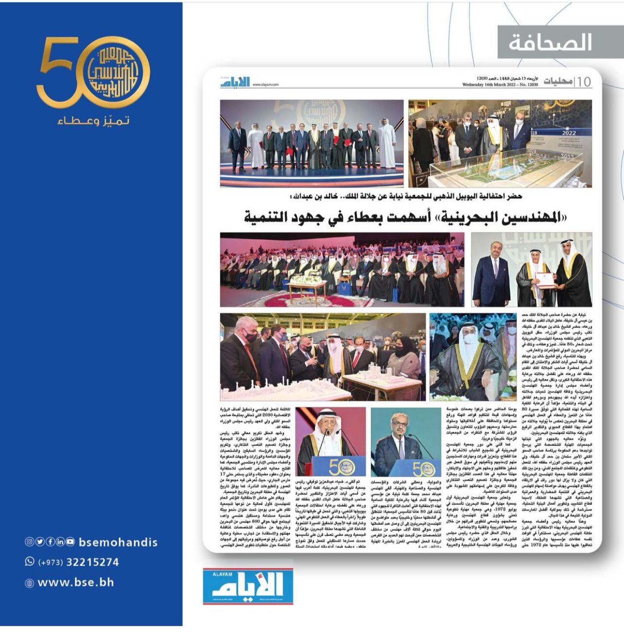 نيابة عن حضرة صاحب الجلالة الملك حمد بن عيسى آل خليفة، عاهل البلاد المفدى حفظه الله ورعاه، حضر الشيخ خالد بن عبدالله آل خليفة، نائب رئيس مجلس الوزراء، حفل اليوبيل الذهبي الذي تنظمه جمعية المهندسين البحرينية تحت شعار «50 عامًا.. تميز وعطاء»، وذلك في مركز البحرين الدولي للمؤتمرات والمعارض.