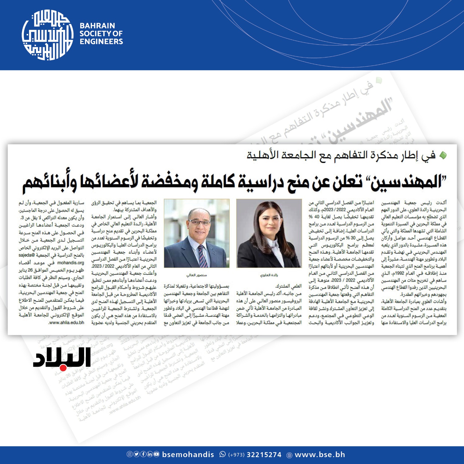 وأشادت العلوي بمبادرة الجامعة الأهلية، بتقديم عدد من المنح الدراسية الكاملة المعفية من الرسوم السنوية لعدد من برامج الدراسات العليا والاستفادة منها اعتباراً من الفصل الدراسي الثاني من العام الأكاديمي 2022 / 2023م، وكذلك تقديمها تخفيضاً يصل لغاية 40 % من الرسوم الدراسية لعدد من برامج الدراسات العليا، بالإضافة الى تخفيضاً يصل إلى 30 % من الرسوم الدراسية لمعظم برامج البكالوريوس التي تقدمها الجامعة الاهلية. وهذه المنح والتخفيضات مخصصة لأعضاء جمعية المهندسين البحرينية او لأبنائهم اعتباراً من الفصل الدراسي الثاني من العام الأكاديمي 2022 / 2023. منوهة الى ان هذه المنح تأتي انطلاقا من مذكرة التفاهم التي وقعتها جمعية المهندسين البحرينية مع الجامعة الأهلية الهادفة الى تعزيز التعاون المشترك ونشر ثقافة الوعي التطوعي في المجتمع، ودعم وتعزيز الجوانب الأكاديمية والبحث العلمي المشترك.
