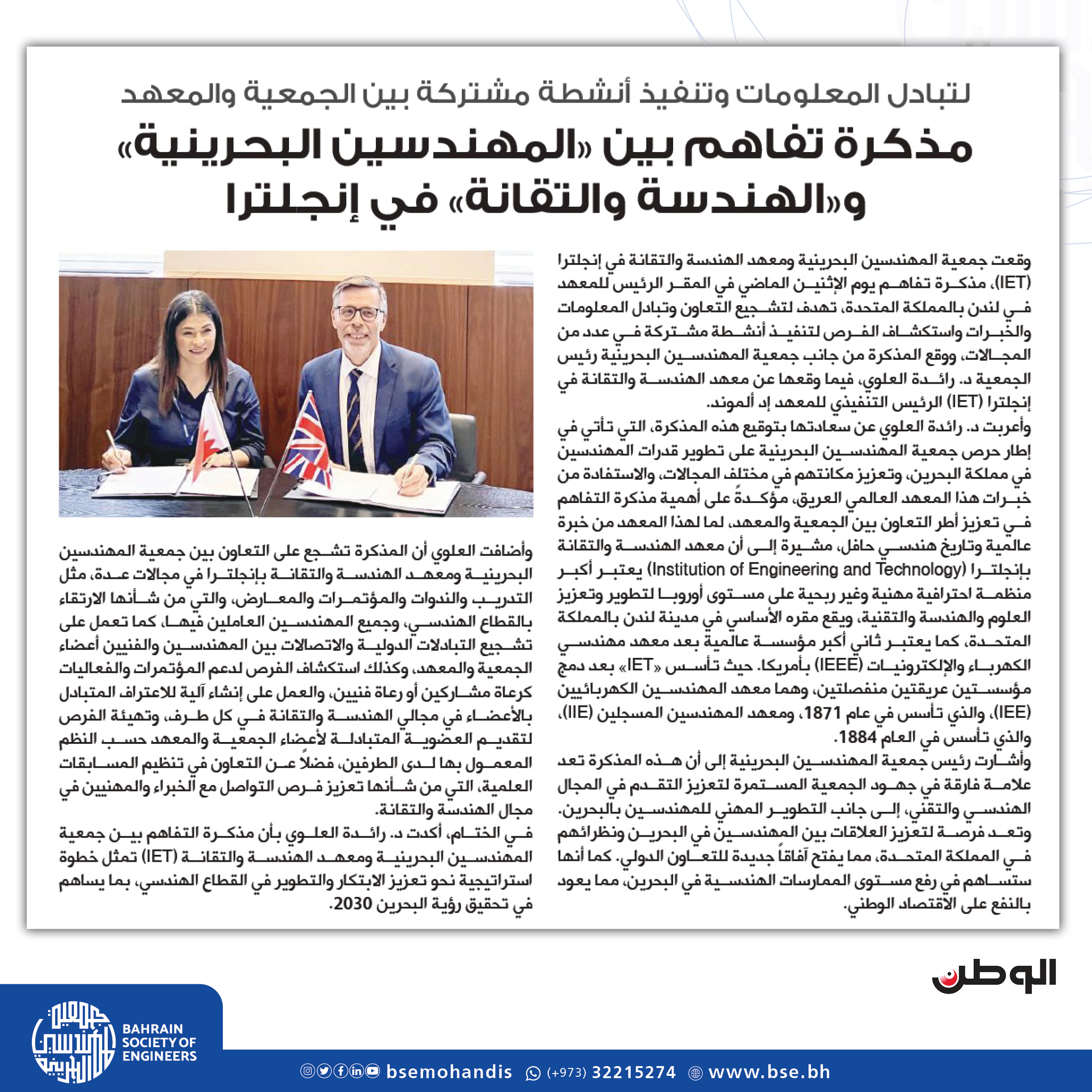 من جانبها أعربت الدكتورة رائدة العلوي عن سعادتها بتوقيع هذه المذكرة التي تأتي في إطار حرص جمعية المهندسين البحرينية على تطوير قدرات المهندسين في مملكة البحرين وتعزيز مكانتهم في مختلف المجالات، والاستفادة من خبرات  هذا المعهد العالمي العريق، مؤكدةً على أهمية مذكرة التفاهم في تعزيز أطر التعاون بين الجمعية والمعهد لما لهذا المعهد من خبرة عالمية وتاريخ هندسي حافل، مشيرة إلى أن معهد الهندسة والتقانة بإنجلترا Institution of Engineering and Technology)‏ (IET) يعتبر أكبر منظمة احترافية مهنية وغير ربحية على مستوى أوروبا لتطوير وتعزيز العلوم والهندسة والتقنية ويقع مقره الأساسي في مدينة لندن بالمملكة المتحدة، كما يعتبر  ثاني أكبر مؤسسة عالمية بعد معهد مهندسي الكهرباء والإلكترونيات (IEEE) بأمريكا. حيث تأسس IET  بعد دمج مؤسستين عريقتين منفصلتين وهما معهد المهندسين الكهربائيين (IEE) والذي تأسس في عام 1871 ومعهد المهندسين المسجلين (IIE)  والذي تأسس في العام 1884.