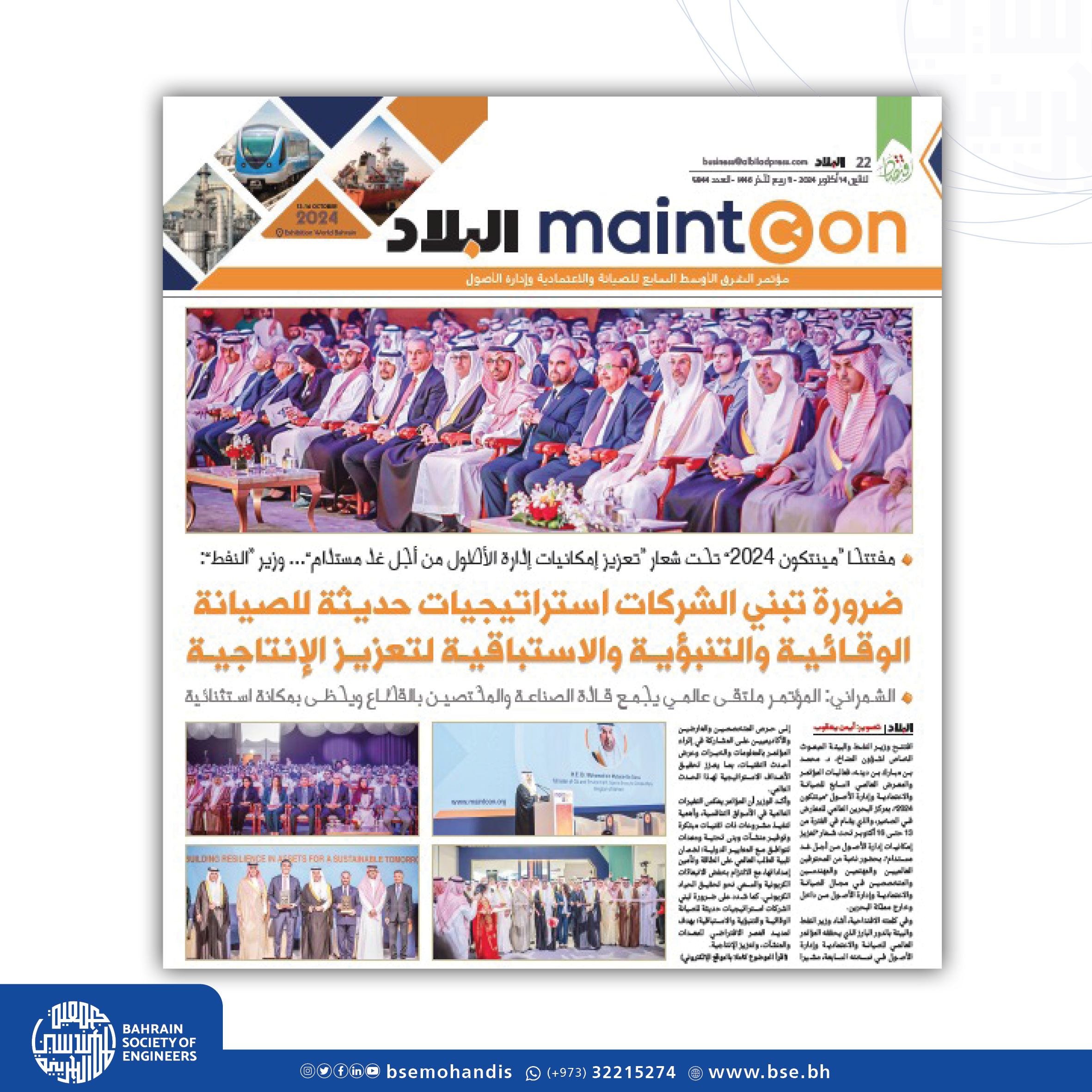 الجدير بالذكر بأن المؤتمر العالمي للصيانة والاعتمادية وإدارة الأصول “مينتكون “ينظم في مملكة البحرين كل عامين منذ عام 2010 من قبل جمعية المهندسين البحرينية والجمعية الخليجية للصيانة والاعتمادية، بالتنسيق والتعاون مع وزارة النفط والبيئة وبدعم من عدد من الشركات الرائدة المحلية والإقليمية والعالمية، منها شركة أرامكو السعودية وشركة “بابكو إنرجيز” وبحضور أكثر من 2000 مشارك من مختلف دول العالم.