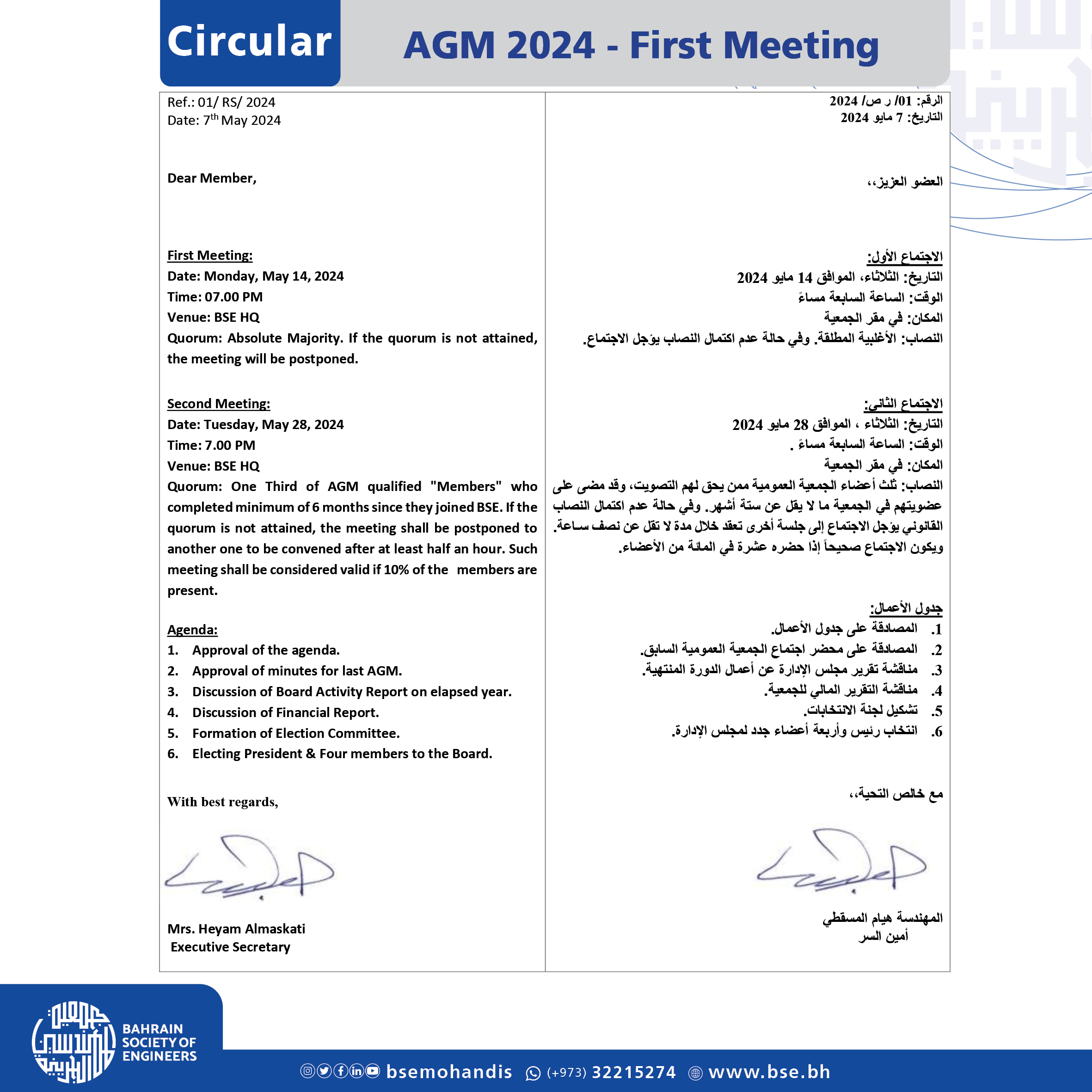 النصاب: الأغلبية المطلقة. إذا كان النصاب لا يبلغ الاجتماع سيتم تأجيل.